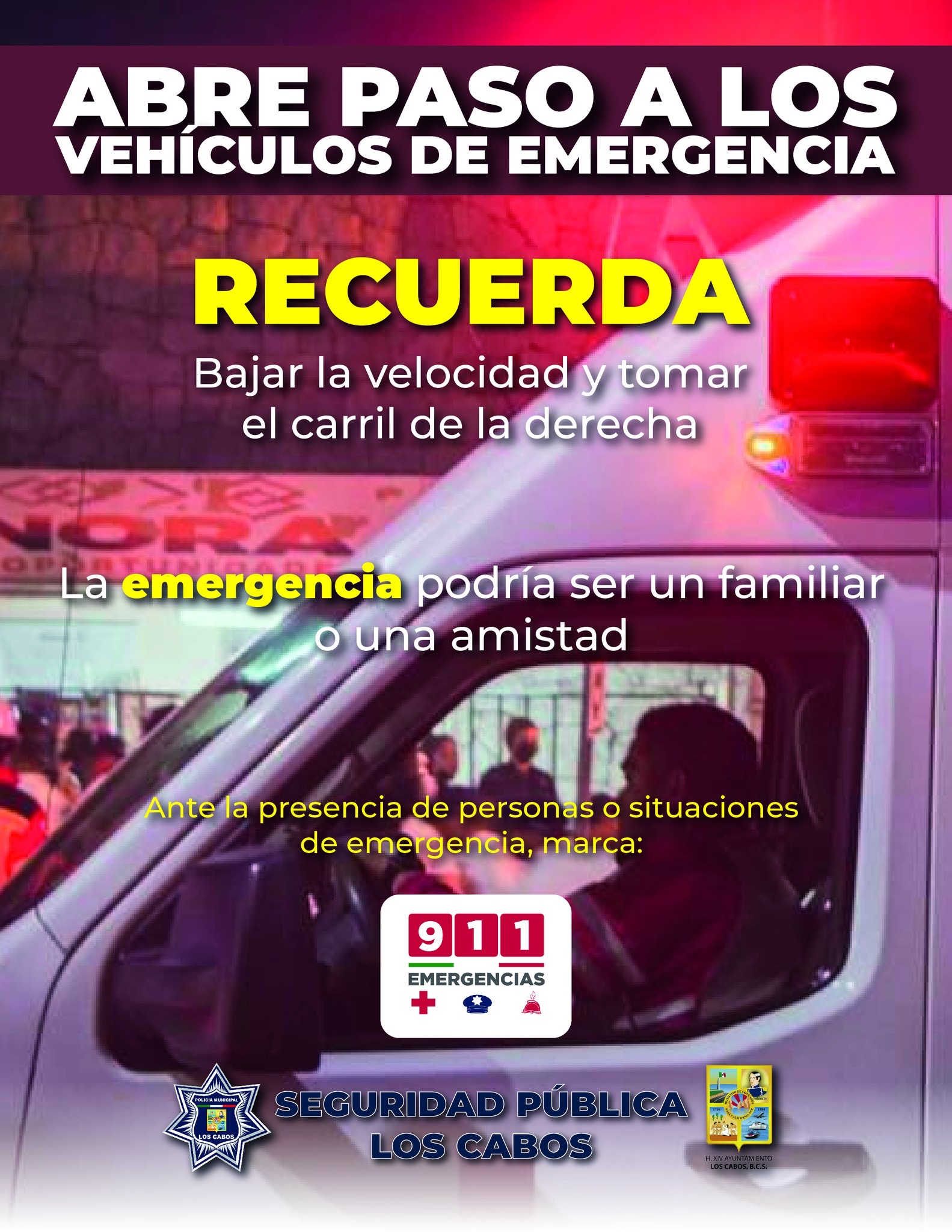 Los Cabos, B.C.S., 28 de abril del 2024.- El Gobierno Municipal de Los Cabos, a través de la Dirección General de Seguridad Pública, Policía Preventiva y Tránsito Municipal, hace un llamado a todas las personas conductoras para recordar la importancia de ceder el paso a los vehículos de emergencia en carreteras y calles cuando se escuche el sonido de las sirenas y se aproxime un vehículo de emergencia.