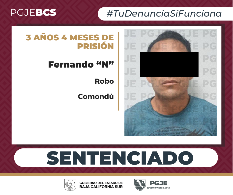 Ante las pruebas presentadas por la Agente del Ministerio Público de la Unidad de Investigación de Delitos Diversos en Ciudad Constitución, la Procuraduría General de Justicia del Estado (PGJE) obtuvo sentencia de 3 años 4 meses en prisión, para Fernando “N”, también conocido con el apodo de “El Pato”.