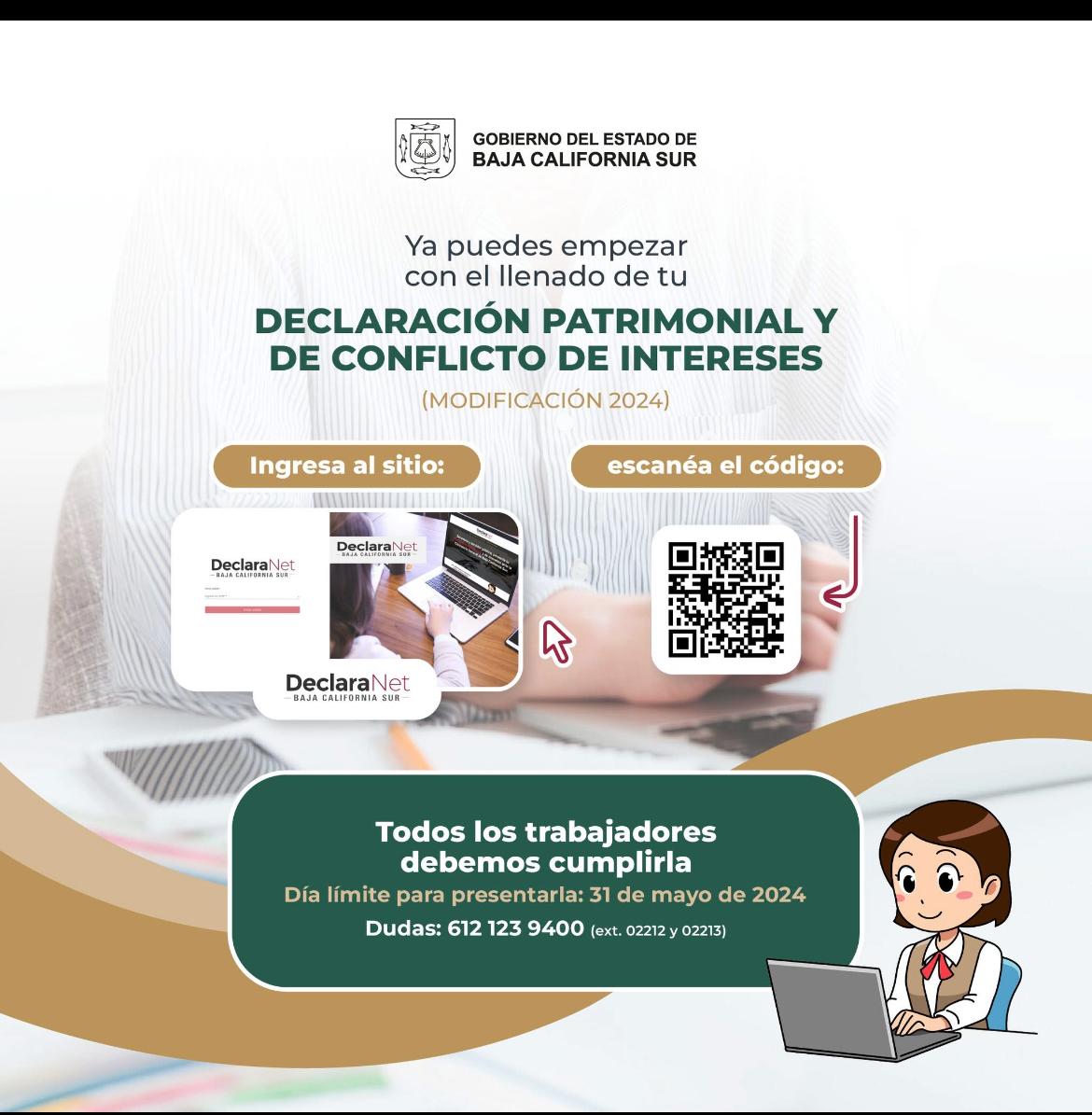 Especificó que, todas y todos los servidores públicos están obligados a presentar dicho proceso, y pueden hacerlo en el sitio https://contraloria.bcs.gob.mx/Declaranet/, lo que incluye la modificación de 2025, con la información de 2024, para firma a partir del primero de mayo.