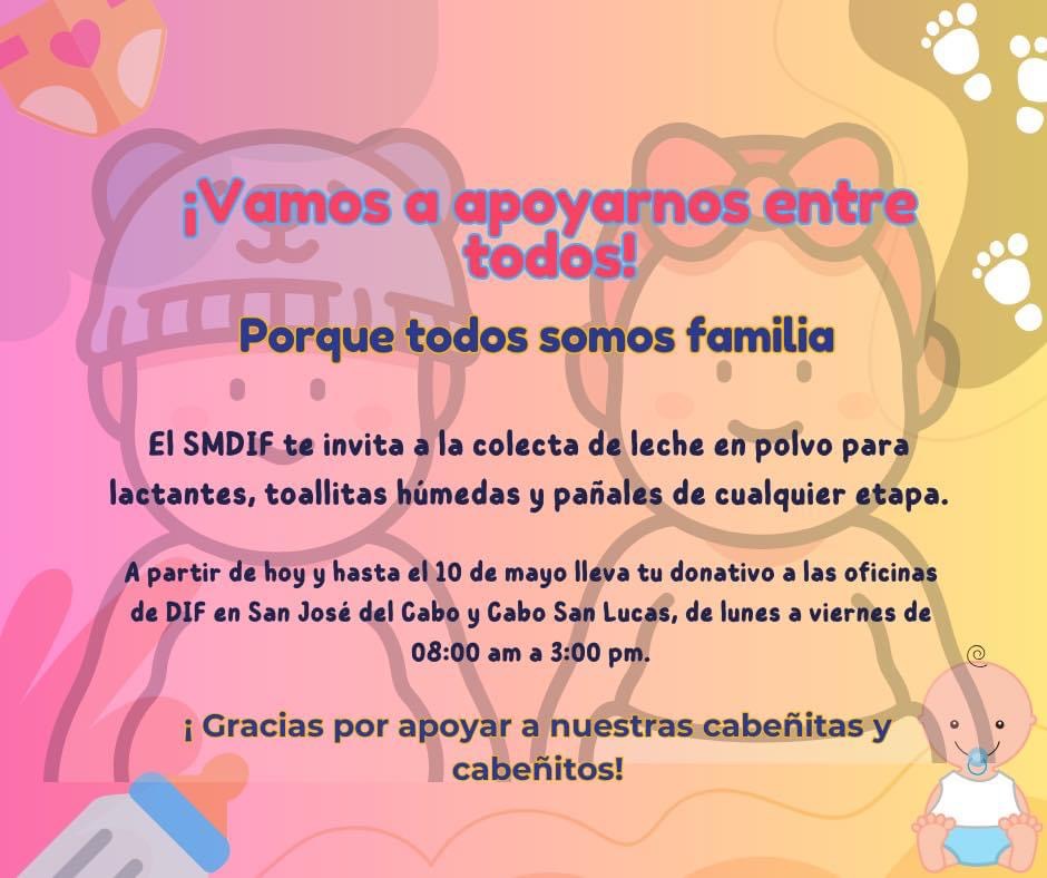Los Cabos, B.C.S. 09 mayo 2024.- El Sistema Municipal para el Desarrollo Integral de Familia (SMDIF) Los Cabos, invita a la ciudadanía a sumarse a la colecta de toallitas húmedas, leche en polvo y pañales de cualquier etapa que se realiza para asistir a menores lactantes-maternales en el municipio.