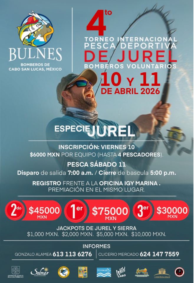 Los Cabos, Baja California Sur.– El Cuerpo de Bomberos y Rescatistas de Cabo San Lucas, a través de su Patronato, presentó de manera oficial la convocatoria y el cartel del Cuarto Torneo de Pesca Deportiva de Jurel “Bulnes” 2026, que se llevará a cabo los días 10 y 11 de abril en Cabo San Lucas, con una bolsa garantizada de 150 mil pesos en premios.