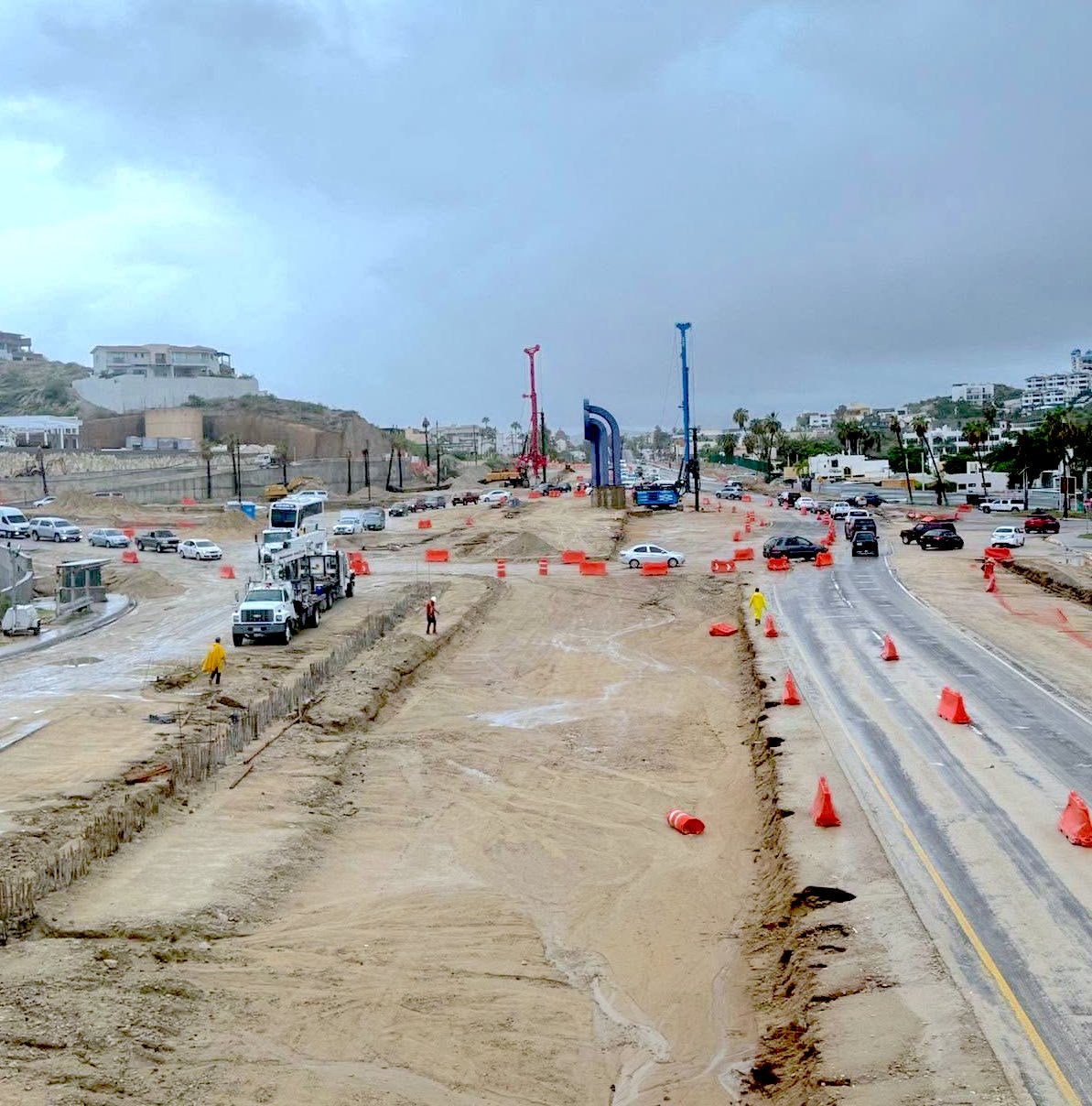 Los Cabos, Baja California Sur.- El titular de la Dirección General de Desarrollo Urbano, Roberto Flores Rivera, informó, que, si bien el tránsito vehicular donde se realizan los trabajos de construcción en la glorieta de Fonatur opera de manera normal, debido a las precipitaciones presentadas este jueves 04 de septiembre, se realizó el cierre parcial de uno de los carriles de circulacion.