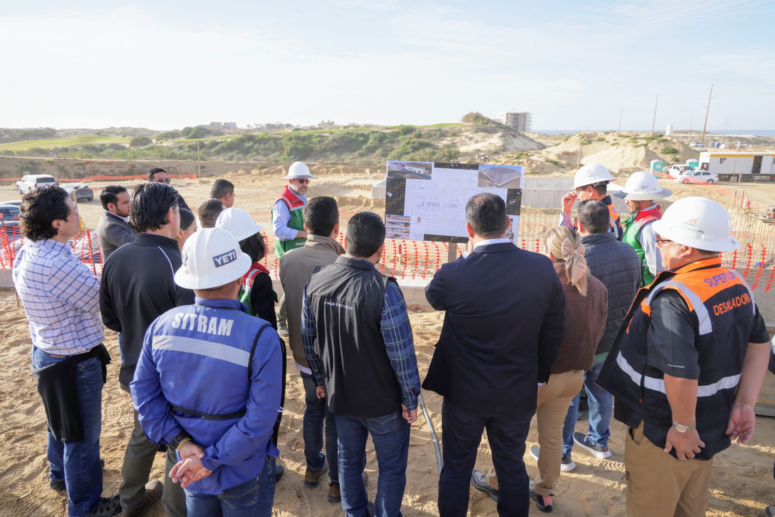 Durante un recorrido de supervisión, el tercer regidor del Ayuntamiento de Los Cabos y presidente de la Comisión Edilicia Permanente de Saneamiento, Agua Potable y Alcantarillado, Andrés Liceaga Gómez, acompañado por la novena regidora Marbella González Díaz y el primer regidor José Manuel Larumbe Pineda, verificó los avances del proyecto junto al director general de Agua Potable, Ramón Rubio Apodaca, y representantes de las empresas encargadas del desarrollo de la planta.