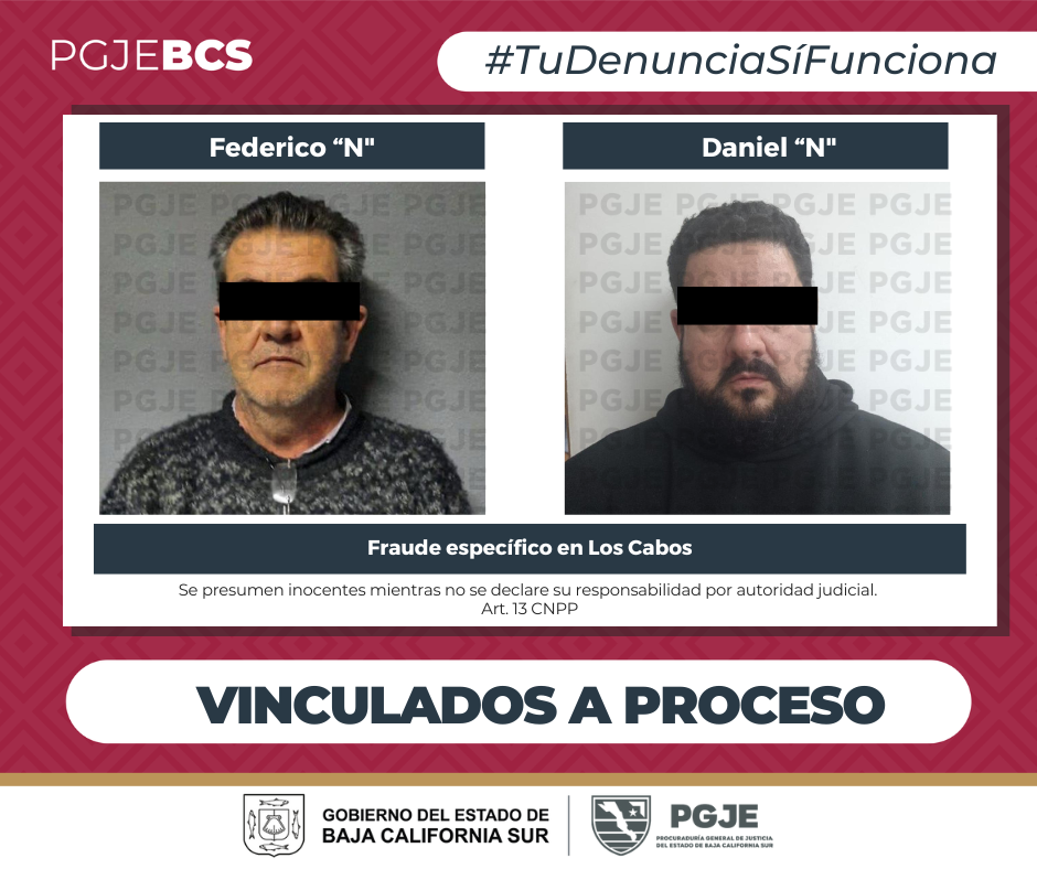 La Procuraduría General de Justicia del Estado (PGJE) de Baja California Sur logró la vinculación a proceso de Federico “N” y Daniel “N” por el delito de fraude específico, luego de que la víctima denunciara la venta indebida de un camión que ya había sido previamente comercializado.