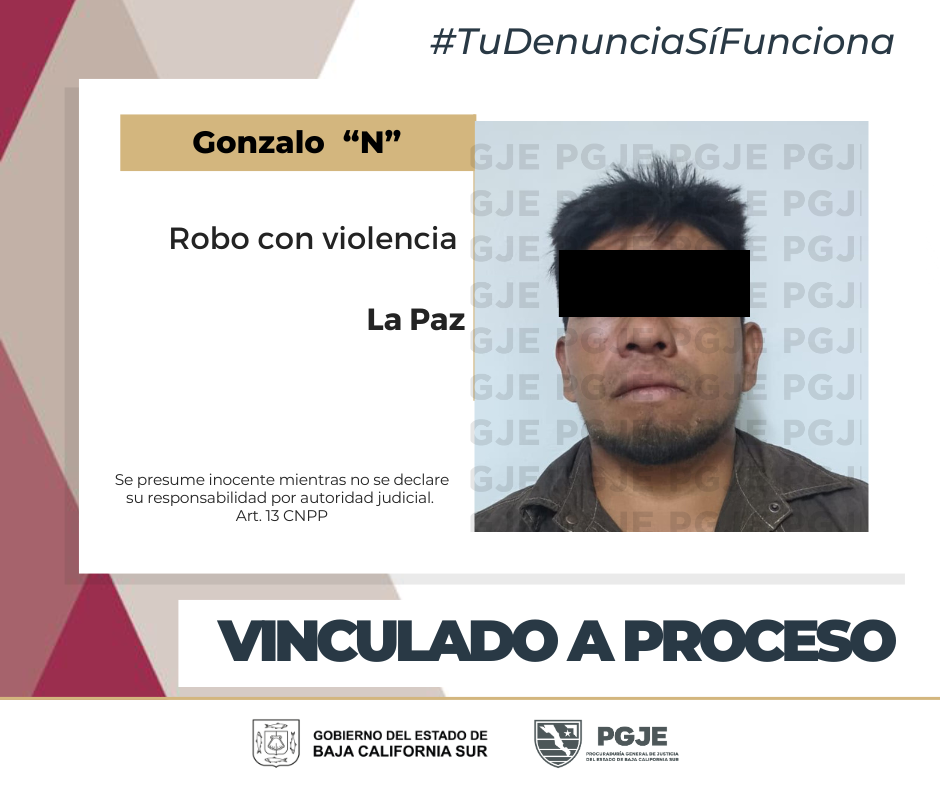 Durante la audiencia celebrada el viernes 27 de septiembre, en el Centro de Justicia Penal de La Paz, el agente del Ministerio Público de la Unidad Especializada en Atención a Personas Detenidas, formuló la imputación del delito y presentó los datos de prueba necesarios para solicitar la vinculación a proceso del imputado, la cual fue concedida por el Juez de Control quien le impuso la medida cautelar que le prohíbe acercarse a la víctima y a ciertos lugares.