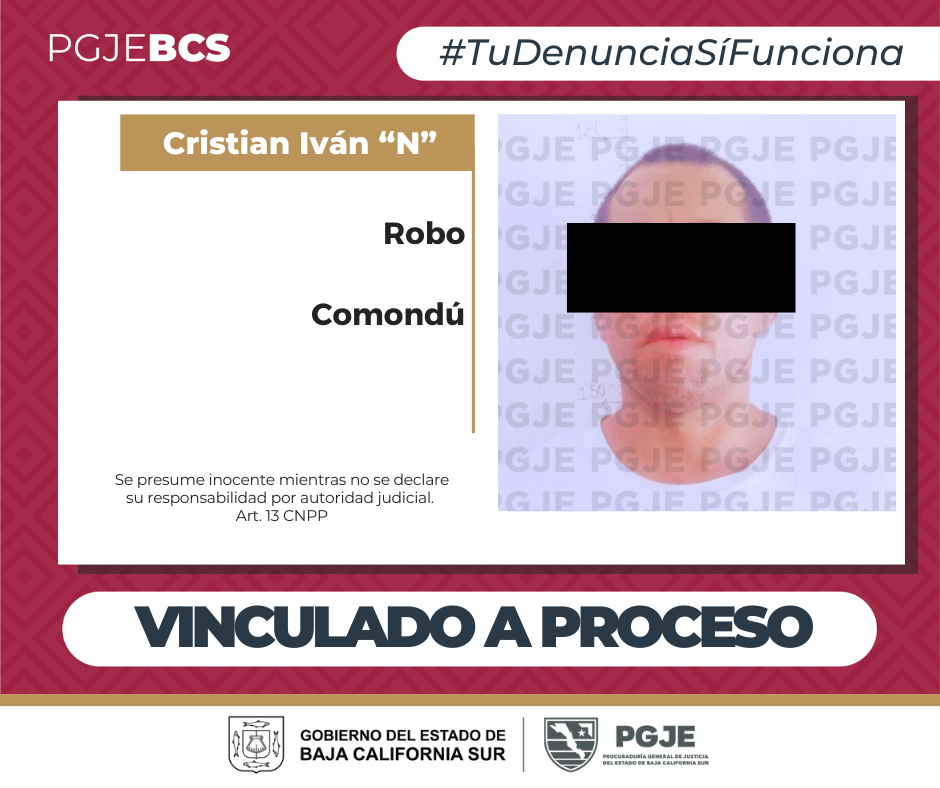 La Procuraduría General de Justicia del Estado (PGJE) de Baja California Sur, tendrá 2 meses para cerrar la investigación complementaria y presentar a la autoridad judicial los datos de prueba que relacionen a Cristian Iván “N”, en el delito de robo a establecimiento comercial abierto al público con violencia moral, que probablemente cometió el pasado 12 de octubre del año en curso en Ciudad Constitución.