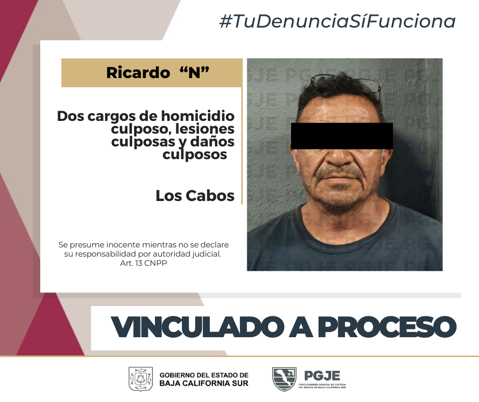 La Procuraduría General de Justicia del Estado (PGJE) de Baja California Sur obtuvo la vinculación a proceso de Ricardo “N”, por los delitos de homicidio culposo en agravio de dos personas, daños culposos y lesiones culposas, tras un accidente de tránsito ocurrido el 28 de septiembre en Cabo San Lucas.